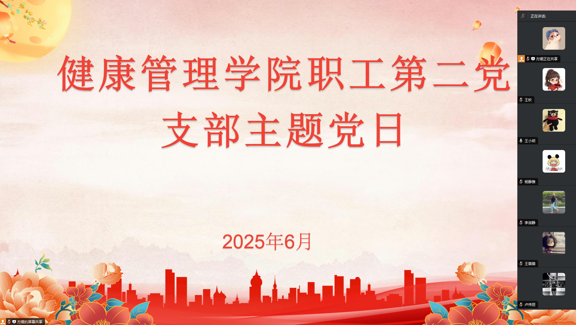 会议开展活动第一项,党支部书记方媛根据6月份安全生产月主题“人人讲安全、个个会应急——查找身边安全隐患”开展安全知识宣讲、安全警示教育、安全隐患排查等活动。她提到,全体党员要积极树立安全意识,通过纪律约束,严格履行安全职责,在安全培训中杜绝“走过场”,确保真正掌握安全技能。
